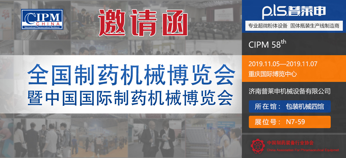 第58届(2019年秋季)全国制药机械暨中国国际制药机械博览会将于2019年11月05日至11月07日在重庆国际博览中心举行。该博览会曾连续被中华人民共和国商务部列为重点支持展会之一, 是业界公认的专业化、国际化、规模大、展品全、观众多,集贸易、研讨于一体的制药装备行业交流平台。