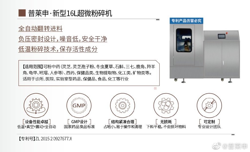 1、低温 普莱申采用低温冷冻的粉碎方式,使得中药粉碎过成减少粉尘