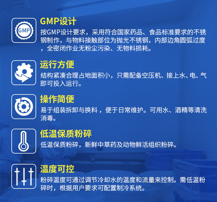 同时该设备的特点包含1. GMP设计 按GMP设计要求,采用符合国家药品、食品标准要求的不锈钢制作,与物料接触部位为抛光不锈钢,内部边角圆弧过度,全密闭作业无粉尘污染、无物料损耗。2. 运行方便 结构紧凑合理占地面积小,只需配备空压机、接上水、电、气即可投入运行。3. 操作简便 易于组装拆卸与换料,便于日常维护。可用水、酒精等清洗消毒。4. 低温保质粉碎 低温保质粉碎,新鲜中草药及动物鲜活组织粉碎。5. 温度可控 粉碎温度可通过调节冷却水的温度和流量来控制。需低温粉碎时,根据用户要求可配置制冷系统
